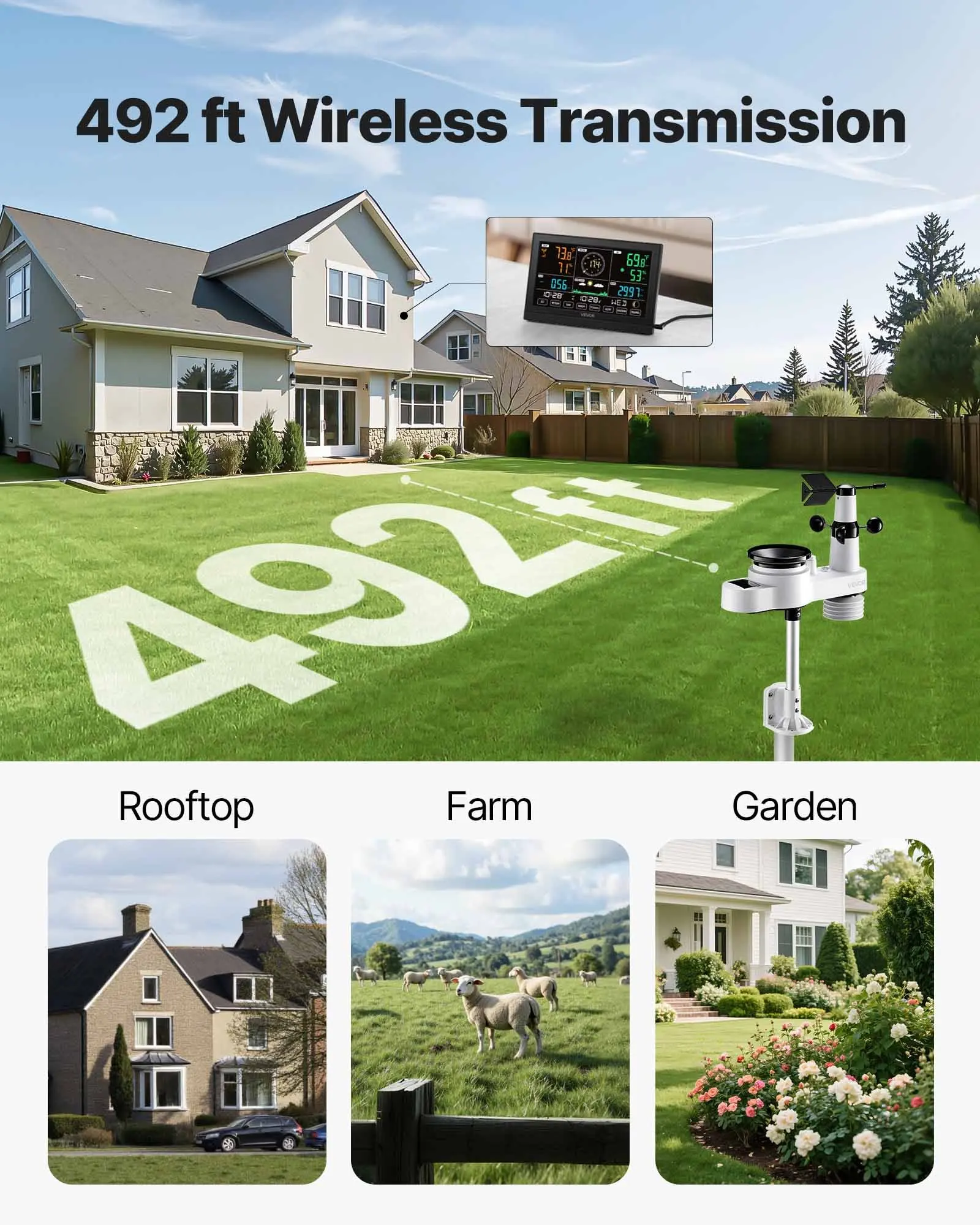 5-in-1 Wireless Weather Station 7.5 In Display Indoor Outdoor Thermometer Sensor